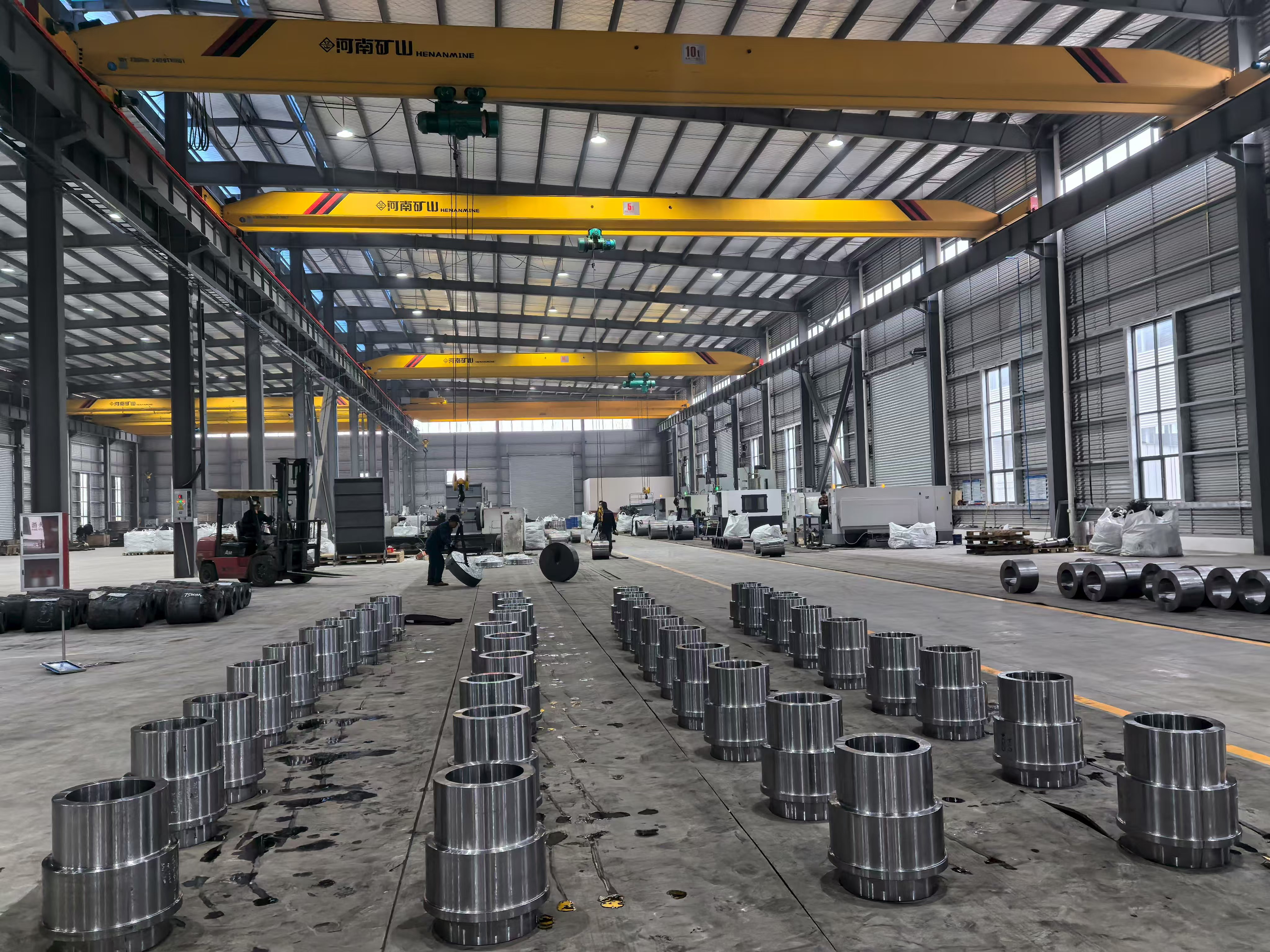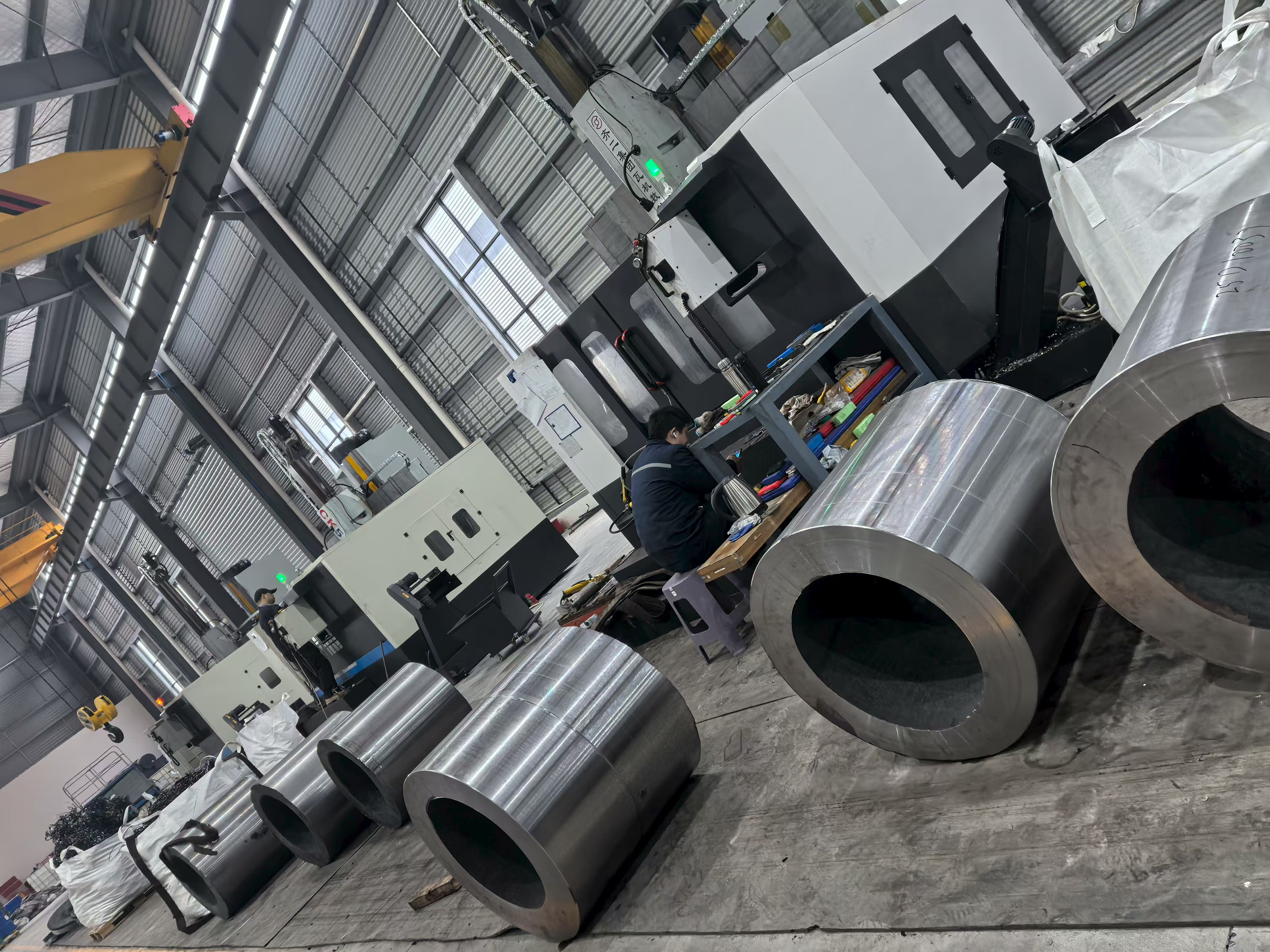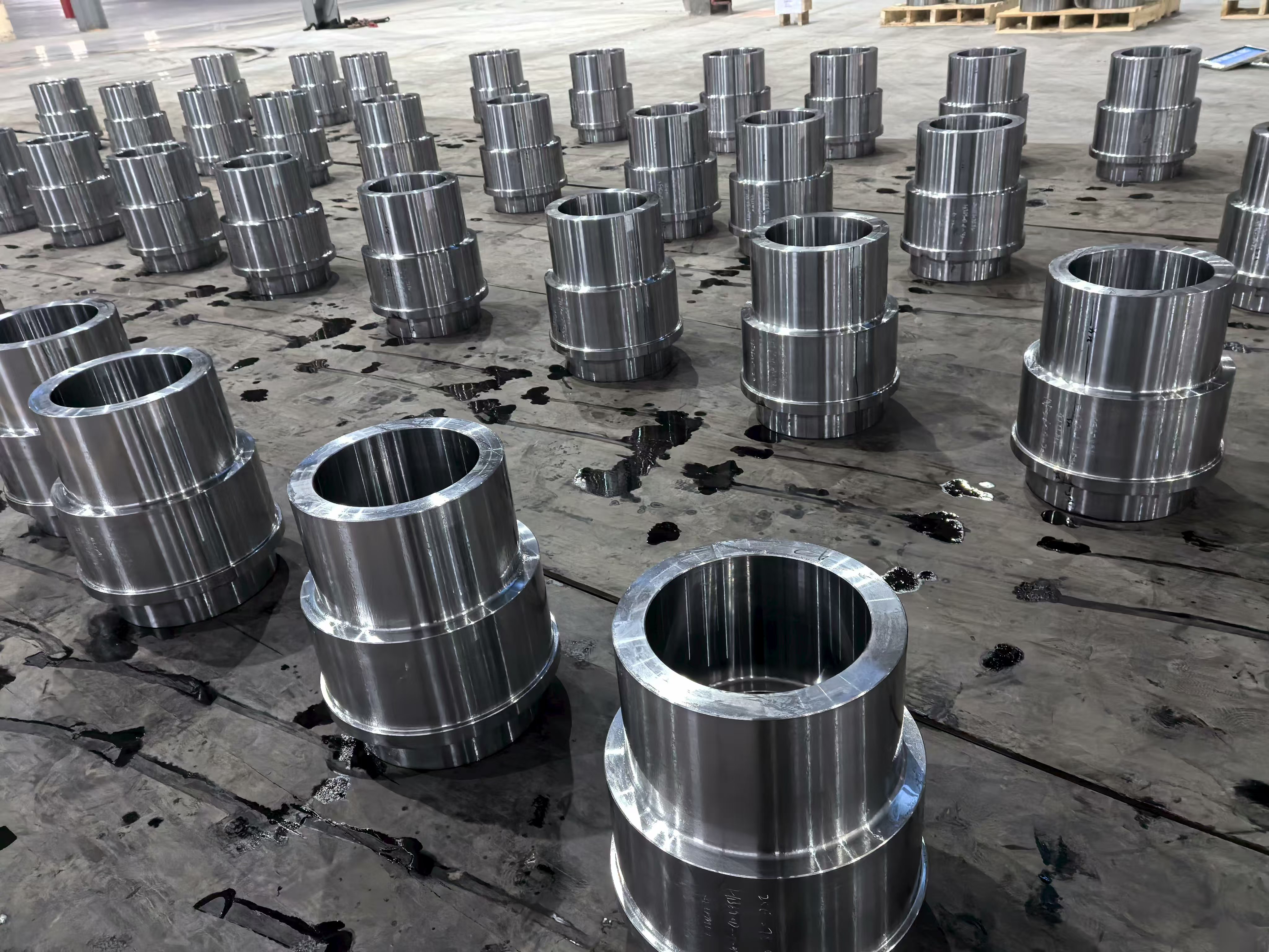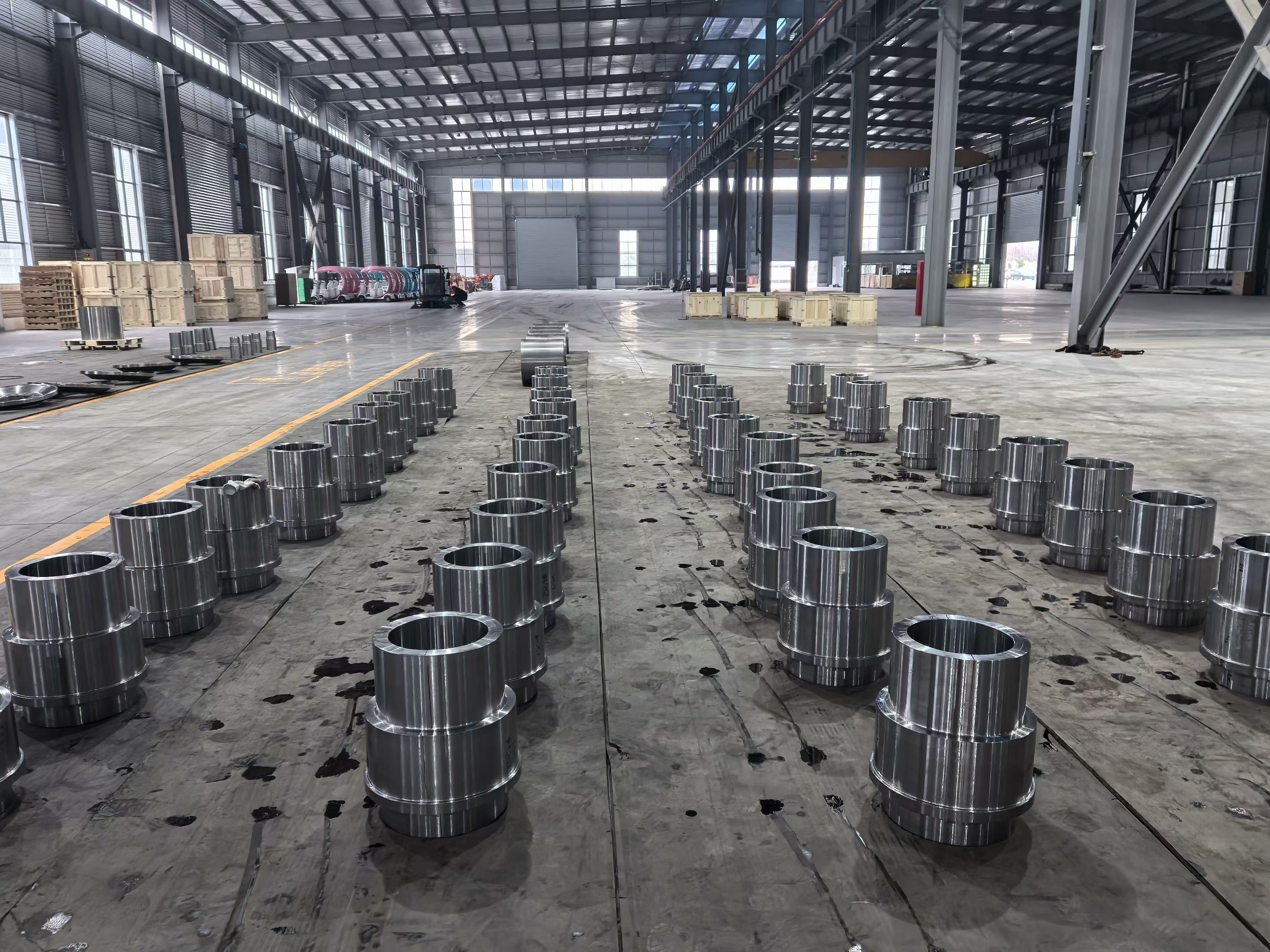 ภาพสิ่งอำนวยความสะดวกจากฐานการผลิตแสดงแถวของวงแหวนเหล็กที่ผลิตด้วยเครื่องจักรอย่างแม่นยำและส่วนประกอบดุมที่วางอยู่ทั่วพื้นที่โรงงานโดยจัดเรียงเป็นชุดอย่างเป็นระบบ ซึ่งเป็นเครื่องพิสูจน์ด้วยภาพถึงความสามารถในการผลิตในปริมาณมากของกลุ่ม ส่วนประกอบแต่ละชิ้นแสดงให้เห็นถึงพื้นผิวที่สม่ำเสมอ ความสม่ำเสมอของมิติ และพิกัดความเผื่อที่แน่นซึ่งเป็นผลมาจากการผสมผสานการตีขึ้นรูป การอบชุบด้วยความร้อน และการตัดเฉือน CNC ภายในระบบการผลิตแบบครบวงจรเพียงระบบเดียว โรงงานตัดเฉือนมีเครื่องกลึง CNC และศูนย์เครื่องจักรกลหลายเครื่องที่ทำงานพร้อมกัน โดยมีชิ้นงานตั้งแต่ปลอกทรงกระบอกเจาะขนาดใหญ่ไปจนถึงชุดประกอบดุมที่มีหน้าแปลนที่ซับซ้อน