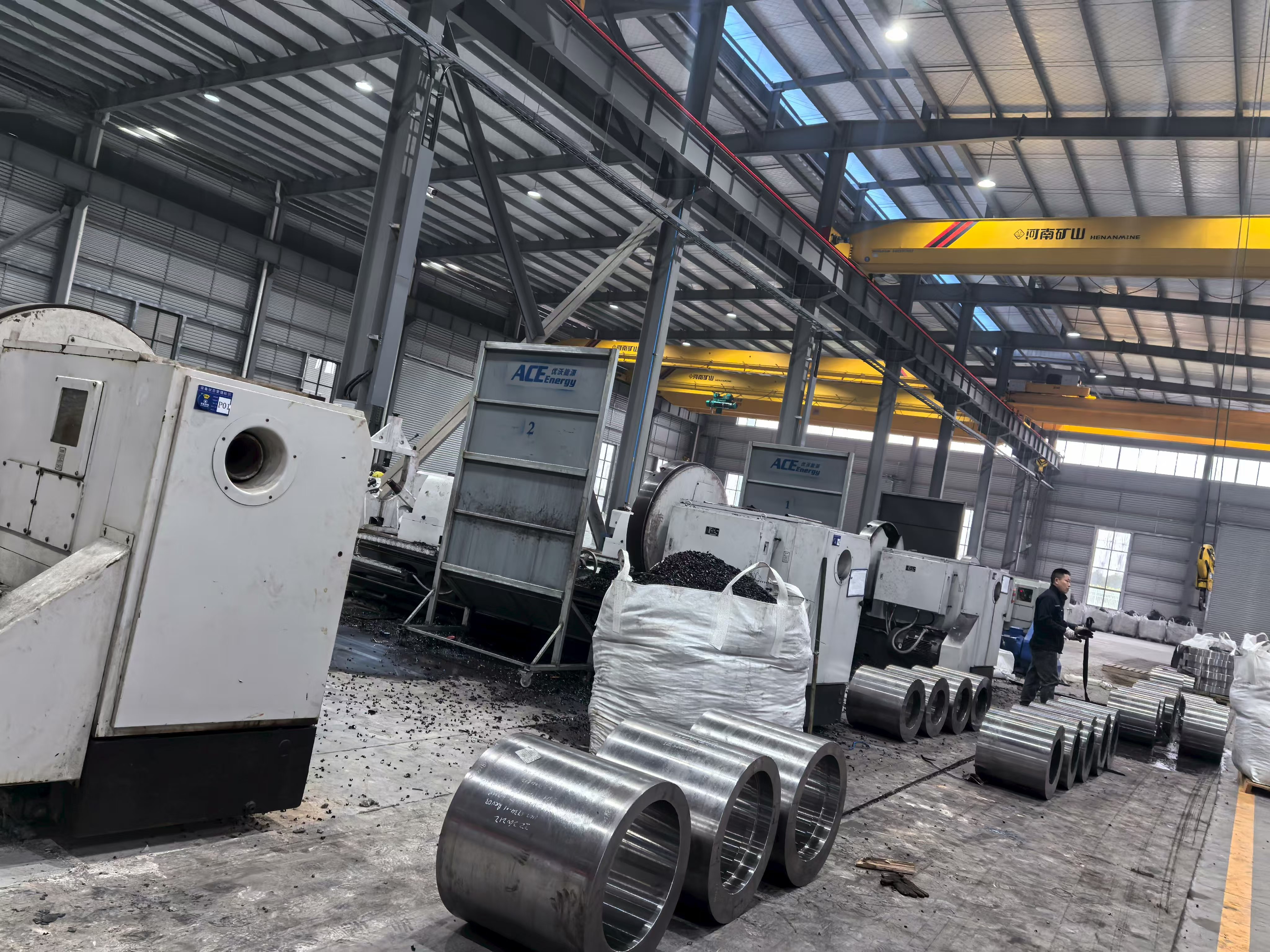 ฐานการผลิตนี้เป็นโรงงานหลักและใหญ่ที่สุดของกลุ่ม ACE Group ซึ่งเป็นแหล่งผลิตผลงานการตีขึ้นรูป การอบชุบด้วยความร้อน และการตัดเฉือนที่แม่นยำจำนวนมากของกลุ่ม ACE ภาพถ่ายสิ่งอำนวยความสะดวกแสดงให้เห็นขนาดของการดำเนินการนี้อย่างชัดเจน: โรงปฏิบัติงานโครงสร้างเหล็กทรงสูงที่กว้างขวางซึ่งมีเครนเหนือศีรษะหลายตัว เครื่องแมชชีนนิ่งเซ็นเตอร์ CNC ขนาดใหญ่ที่ประมวลผลส่วนประกอบทรงกระบอกหนัก และชุดชิ้นส่วนที่กลึงเสร็จแล้วอย่างแม่นยำที่จัดอย่างประณีตพร้อมสำหรับการตรวจสอบและจัดส่ง แผนผังพื้นโรงงานสะท้อนให้เห็นถึงการจัดการการไหลที่เป็นระบบ — วัตถุดิบและวัสดุที่อยู่ในกระบวนการจะถูกแยกออกจากส่วนประกอบที่เสร็จสมบูรณ์ และโซนการผลิตจะถูกกำหนดด้วยเครื่องหมายบนพื้นซึ่งสอดคล้องกับหลักการผลิตแบบ Lean