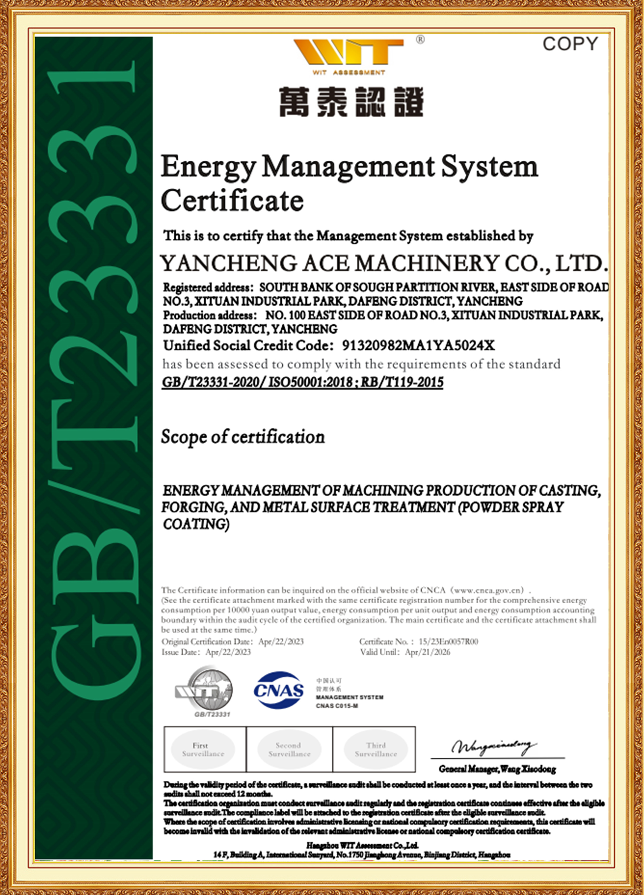มณฑลเจียงซู ACE พลังงานเทคโนโลยี จำกัด: ฐานการผลิตหลักของกลุ่ม ซึ่งเริ่มดำเนินการอย่างเป็นทางการในเดือนพฤศจิกายน 2568 ครอบคลุมพื้นที่ 55 เอเคอร์ โดยมีพื้นที่รวมเกิน 50,018 ตารางเมตร โรงงานประกอบด้วยค้อนไฟฟ้าไฮดรอลิกขนาด 3 ตัน 5 ตัน และ 15 ตัน เครื่องรีดวงแหวนแนวตั้ง 1 เมตรและ 1.5 เมตร เตาให้ความร้อนก๊าซธรรมชาติประหยัดพลังงาน เตาต้านทานความร้อน ถังดับ อุปกรณ์ชุบแข็งแบบเหนี่ยวนำ ศูนย์เครื่องจักรกล และอุปกรณ์การผลิตอื่นๆ